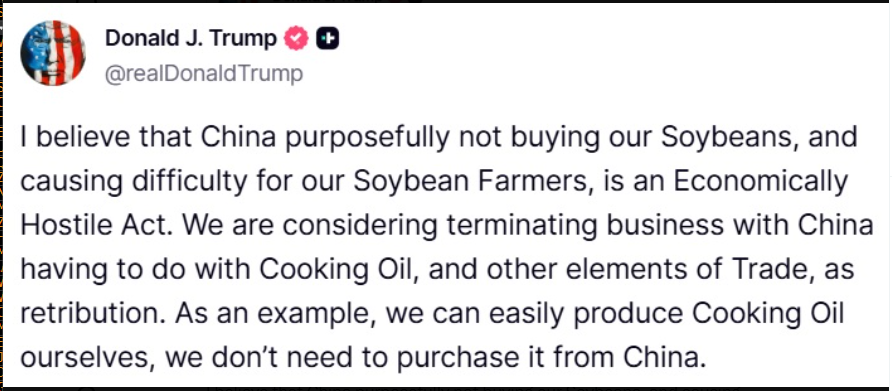 E’ da notare che a un’ora dalla chiusura l’S&P 500 guadagnava lo 0.30% ed è stato apparentemente ricacciato in passivo dalla pubblicazione di un post social da parte di Trump in cui si lamentava che la Cina non compra più la soya americana (è una faccenda nota da mesi, compra infatti quella brasiliana) e minacciava ritorsioni su olio alimentare ed altro.