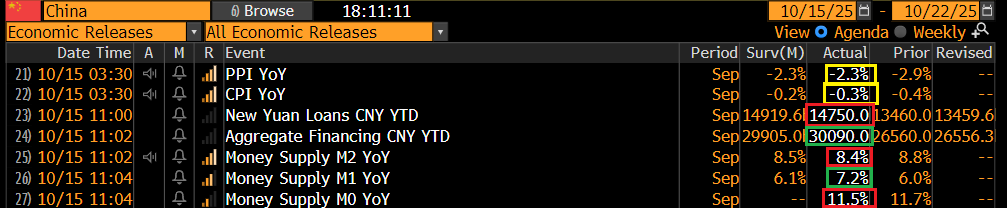 Anche la disinflazione dei prezzi alla produzione si è ridotta. Più tardi, nella mattinata europea, sono usciti gli aggregati di credito di settembre, e i loans hanno deluso le attese, ma il total social financing ha superato le stime grazie allo shadow banking system. La domanda di credito continua ad essere moderata da parte dei privati, aziende e consumatori, e più forte come emissioni governative.