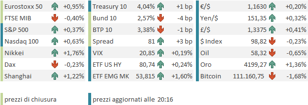 La scivolata dell’S&P ha pesato sulle chiusure europee, che hanno ridotto i guadagni in chiusura. Se l’Eurostoxx 50 ha mantenuto un bel progresso, puntellato da LVMH, e in generale da Parigi, e ASML e i semiconduttori, il Dax, Il FTSE Mib e l’Ibex sono terminati in negativo, zavorrati il primo dal settori difesa, in piena correzione, e quello medicale, e gli altri 2 dalle banche. La risk adversion ha messo pressione sui rendimenti, il progresso dell’€ si è un po’ ridotto. Tra le commodity i preziosi continuano a dettare legge, con l’oro a lungo sopra 4.200$ l’oncia.