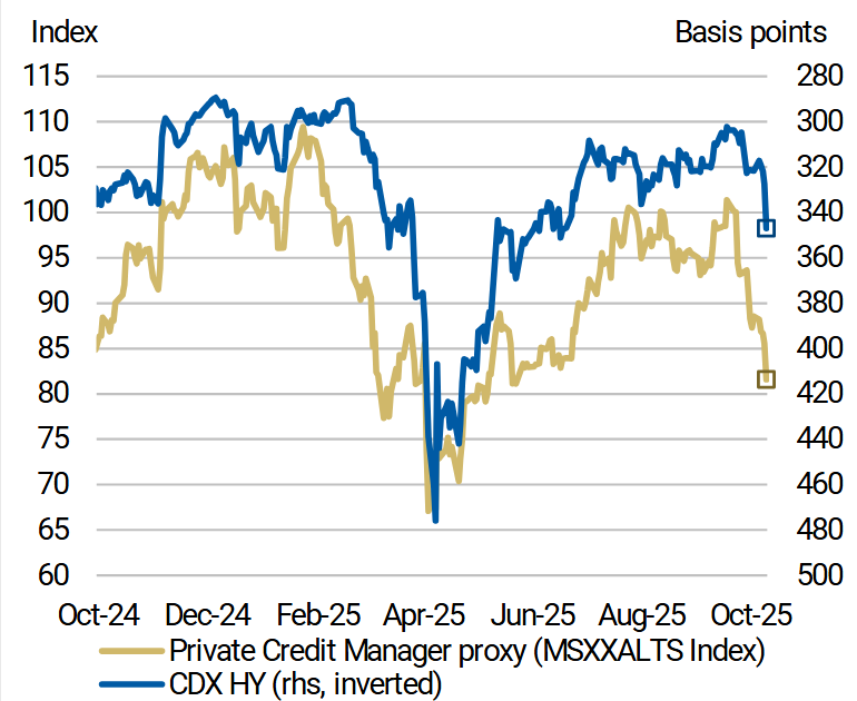 I risultati brillanti pubblicati dalle grandi banche tra ieri e oggi hanno fatto mettere da parte al momento la questione del deterioramento dei fondamentali del credito al consumo (quanto meno certo consumo, auto e auto parts), a cui sono legati i fallimenti di Tricolor e First Brands. Ma le parti del mercato dedicate continuano a faticare. In uno studio, Morgan Stanley ha mostrato la divergenza tra le quotazioni in borsa di alcuni player coinvolti nella gestione dei senior collateralized loans e gli spread del high yield, a illustrare come il mercato del credito non abbia ancora reagito pienamente a questi segnali di stress (vedi grafico sotto, con la scala dello spread HY invertita).