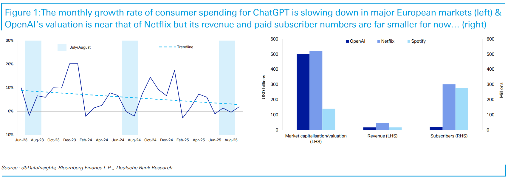 Nel grafico a sinistra si nota che la crescita dei sottoscrittori in Europa sta rallentando vistosamente. Altman ha dichiarato che gli utenti settimanali sono passati da 550 milioni a fine marzo agli 800 milioni attuali, e dovrebbero diventare un un miliardo entro fine anno. Ma ha solo 20 milioni di abbonati, contro i 300 milioni di Netflix, che ha una capitalizzazione simile, e Spotify, che vale 1/4, ne ha 276 milioni. La domanda che si fa Deutsche Bank è, quanti di questo miliardo di utilizzatori settimanali potrà essere convertito in abbonati? Quando le revenues potranno cominciare a ripagare gli enormi investimenti che OpenAI sta facendo, considerando la concorrenza di LLM che c’è, anche dagli operatori cinesi?