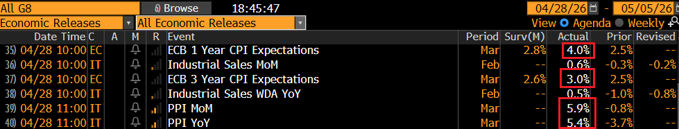 La seduta europea è iniziata con un tono incerto. D’altronde il petrolio si è fatto trovare un altro paio di punti percentuali più alto stamattina, con il Brent europeo oltre 110$. I rendimenti hanno da subito reagito mostrando rialzi. In mattinata è circolato un report di CNN secondo il quale USA e Iran non erano più così distanti come richieste e questo ha risollevato un po’ il sentiment, anche se il petrolio non ne ha risentito. I rendimenti hanno continuato ad accumulare rialzi, messi forse sotto pressione dalle aspettative di inflazione ECB sopra attese, e dai prezzi alla produzione italiani di marzo elevati. Report che normalmente vengono ignorati, (in particolare le expectations ECB, il cui consenso è stato oggi formato dalla media di appena 4 previsioni) ma che in questo caso colpiscono un nervo scoperto.