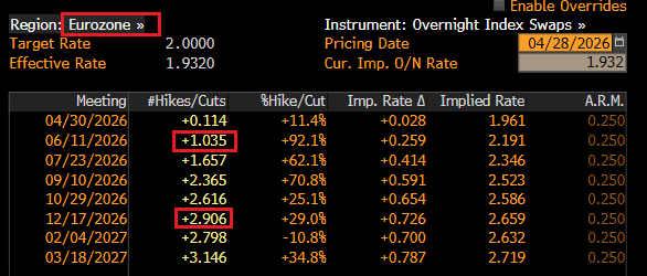 Le piazze europee hanno accusato soprattutto il rialzo dell’oil che vede Brent recuperare quota 110$ e il WTI quota 100, e così abbiamo ancora moderate perdite per gli indici core e invece Madrid e Milano che ancora si vedono supportare da banche e utilities, molto ben rappresentati nei rispettivi indici, oltre ovviamente all’energy. I rendimenti però tornano a salire forte, con il focus sulla parte breve, che è forse uno dei fattori che favoriscono le banche. La curva monetaria € è tornata quasi a scontare 3 rialzi per il 2026, di cui il primo certo entro il meeting dell’11 giugno.