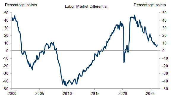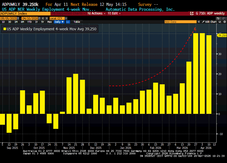 Detto questo, un grafico di questa giovane serie mostra chiaramente un bel miglioramento nei primi mesi del 2026 rispetto ai 10.000 nuovi occupati osservati l’anno scorso, con rilevazioni a tratti negative. Vedremo venerdì 8 maggio il labour market report di Aprile se riporterà interamente questa crescita.