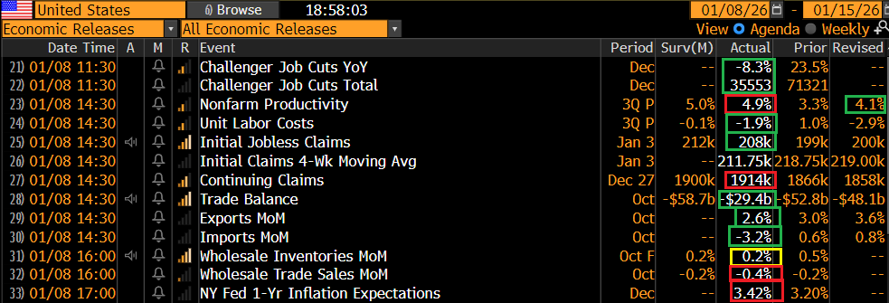 Wall Street è rimasta un po’ più impantanata, visto che questo tipo di numeri allontana (forse) ulteriore easing. E comunque ad alimentare incertezza, nel breve, resta la situazione geopolitica, la pubblicazione del labour market report di dicembre domani, e, ultimo ma non meno importante, la sentenza della corte suprema sui dazi giustificati dal IEEPA (International Emergency Economic Powers Act), che potrebbero venire annullati.