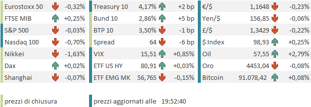 Le piazze europee, su queste basi, chiudono poco mosse, con Eurostoxx 50 e Stoxx 600 marginalmente negativi, il Dax in pari e Milano e Madrid in marginale rialzo. I rendimenti a fine giornata mostrano una marginale tendenza al rialzo, mentre l’€ cede ancora qualcosa ad un dollaro supportato dai dati. Le commodities vedono infine un rimbalzo del petrolio, ma metalli industriali e preziosi ancora deboli e volatili.