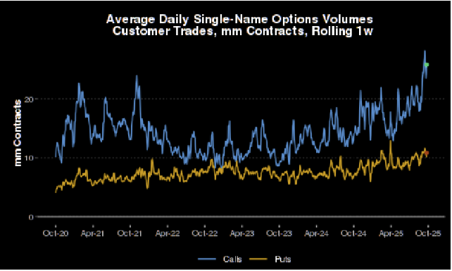 Come osservato più volte il retail è tra i principali fattori dietro a questa price action. Se il grafico in cima al pezzo mostra l’ammontare di domanda di azioni da parte degli investitori privati, questo sotto mostra gli ammontari di opzioni call giornaliere comprate, nuovi derivati brevi che permettono ai retail investor di prendere esposizione rialzista a leva spendendo poco e con stop loss incorporata.