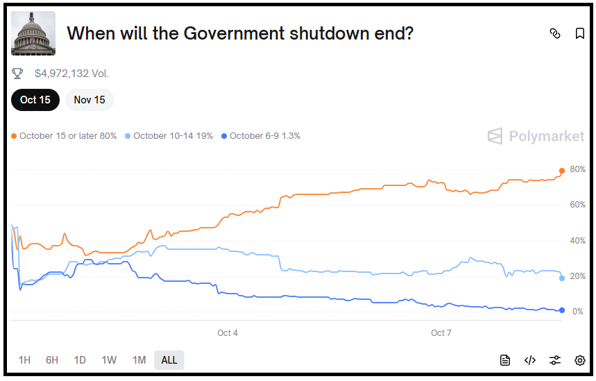 Nel frattempo, le negoziazioni sullo shutdown vanno così bene che su Polymarket la probabilità che sia in vigore ancora dopo il 15 ottobre è giunta all’80%, e quella che superi i 30 giorni di durata è giunta al 28%.
