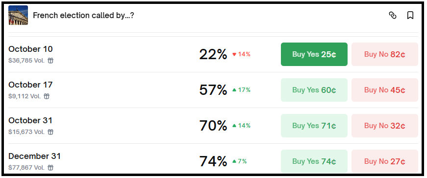 Venendo all’altro tema politico, ovvero la crisi politica in Francia, è interessante notare che il medesimo bookmaker Polymarket quota implicitamente una probabilità del 70% che si tengano nuove elezioni in Francia entro la fine di ottobre. E questo nonostante apparentemente Macron stia cercando di formare una nuova compagine.