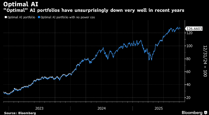 Cameron Crise di Bloomberg ha creato un indice formato da un “portafoglio AI ottimale” contenente 5 big tech e un numero di player minori connessi con l’AI. Uno sguardo al grafico mostra che la performance di questo portafoglio dalla comparsa di ChatGPT nel novembre 2022 è stato stellare.