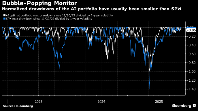 Secondo Crise, un buon segnale che la Bolla AI è prossima allo scoppio sarà quando questo paniere comincerà a sottoperformare l’S&P 500 equal weighted, aggiustato per la volatilità. Ovvero mostrerà drawdown normalizzati superiori a questo indice. Un fenomeno che poi è una rappresentazione quantitativa di una perdita di momentum di questo gruppo di titoli rispetto all’indice generale.