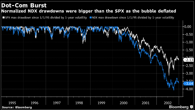 Guarda caso, durante lo scoppio e sgonfiamento della bolla tech degli anni 2000, improvvisamente le correzioni normalizzate del Nasdaq 100 (purtroppo non abbiamo un indice ottimizzato delle “dot.Com”) hanno cominciato ad essere più profonde di quelle dell’S&P 500 (idem) addirittura prima che questo facesse i massimi.