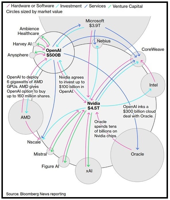 Intanto, in giro continuano a circolare diagrammi che mostrano quanto sia chiuso e circolare il mondo dell’AI, e quindi prono a creare circoli virtuosi in cui le interazioni positive impattano su tutte le azioni coinvolte in maniera robusta, ma anche eventualmente in futuro circoli viziosi, in cui la crisi di uno contagia rapidamente tutti i player.