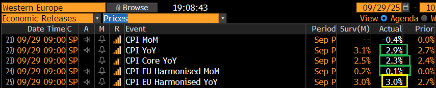Sul fronte macro oggi è iniziata la pubblicazione dei dati di CPI preliminari di settembre per le principali economie dell’area Euro, con la Spagna, che ha sorpreso al ribasso sia come headline che come core.