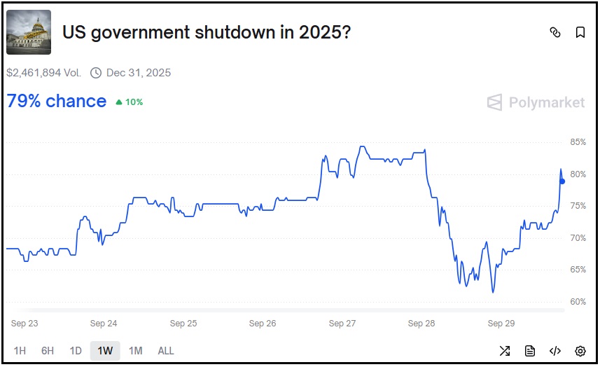Il fatto che Trump abbia ripristinato il meeting coi Congressmen aveva fatto salire un po’ l’ottimismo stamattina, con Polymarket che metteva la probabilità di uno shutdown entro la fine del 2025 al 62% dall’84% di venerdì sera tardi. Ma ora siamo tornati al 79%.