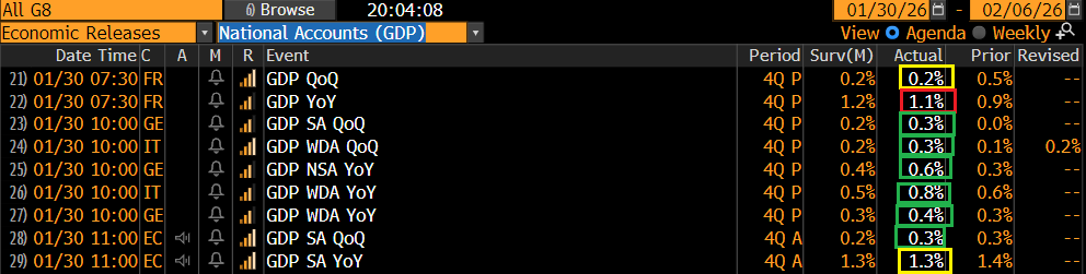 La borsa europea è partita, invece, con un tono costruttivo. Intanto, il ridimensionamento delle attese di easing prodotto dalla nomina di Warsh ha imposto uno stop all’€, attenuando le crescenti preoccupazioni che la sua ascesa potesse porre un freno all’economia europea. E, in secondo luogo, la stessa economia europea ha battuto un colpo, con le prime stime dei GDP delle principali economie EU uscite in mattinata tutte brillanti e sopra attese, tranne la Francia, che comunque cresce.