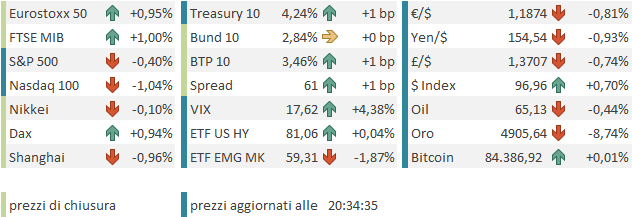 Bisogna dire che le piazze europee sono rimaste abbastanza avulse dal marasma, anche perchè certi livelli paurosi di volatilità sono stati visti solo dopo la loro chiusura. Le principali piazze chiudono con progressi distribuito attorno al punto percentuale (Parigi un po’ sotto, Madrid discretamente sopra). I rendimenti hanno mantenuto la tendenza a salire, mentre l’€ corregge significativamente.