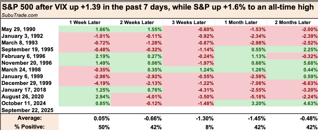 A questo proposito, è interessante notare che nelle ultime 7 sedute, che contengono il triple witching tra l’altro, l’S&P 500 a ieri aveva preso l’1.6%, ma il Vix era salito. Solitamente il fatto che il vix salga a fronte di un mercato che sale (e quindi la volatilità implicita dovrebbe calare) è ritenuto un segnale di volatilità in arrivo. E la casistica illustrata nello schema sotto, filtrata per la circostanza che l’S&P 500 segni un massimo storico, avvalora questa tesi, in particolare dopo 3 settimane.