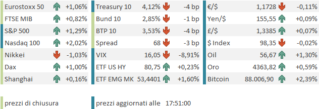 Le chiusure sono distribuite attorno a progressi dell’1%. I rendimenti sono tornati a calare, e l’€ restituisce qualcosa.