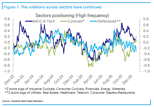 Tra l’altro la rotazione verso i ciclici vista ieri non è una novità. Sta avvenendo da 3 mesi, da quando l’economia USA ha dato segnali di risveglio, come mostra questo grafico di positioning di Deutsche bank.