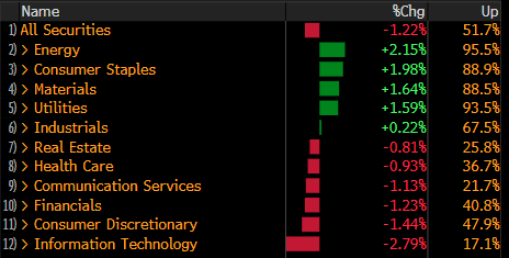 La differenza di price action degli indici generali dipende dal fatto che ieri i flussi principali erano in entrata sui ciclici, mentre oggi domina la fuga dal tech e al software. E visto il peso dei comparti e dei titoli sul totale, sorprende poco che siano in grado di affossare gli indici generali, che tra l’altro erano tornati a contatto con la resistenza costituita dai massimi. Non a caso, per essere una seduta in cui l’S&P 500 cede oltre l’1.2%, il breakdown dei settori è parecchio bilanciato al momento: 5 salgono, e 6 scendono.  E l’IT è il peggiore. E la breadth è davvero insolita: il 50% dei titoli ha performance positiva.