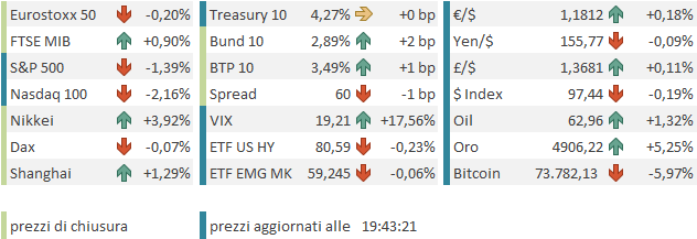 In questo contesto i rendimenti non potevano che salire, e infatti il 10 anni treasury ha preso 4 bp al 4.29% e il 2 anni treasury ne ha presi 5 al 3.59%. La Fed Funds Strip sconta interamente il prossimo taglio non prima del FOMC di luglio.