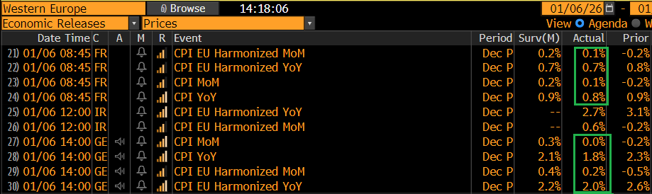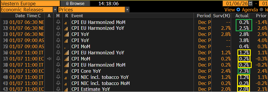 Sul fronte macro, le retail sales tedesche di novembre hanno come al solito deluso, e come al solito quelle di ottobre sono state riviste al rialzo. Qui ormai abbiamo un pattern. E poi ci sono stati i dati residui di inflazione di dicembre, che dopo le sorprese dei giorni scorsi non comportavano rischi particolari: l’Italia è uscita in linea e così la stima EU, con però il dato core che è stato tanto cortese da sorprendere al ribasso.