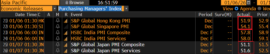 I PMI finali di dicembre sono stati mediocri in Asia, con Hong Kong e Singapore in calo e India e Giappone rivisti al ribasso. Lunedì i PMI cinesi servizi e composite di dicembre (calcolati da S&P Global) erano più o meno rimasti sui livelli di novembre.