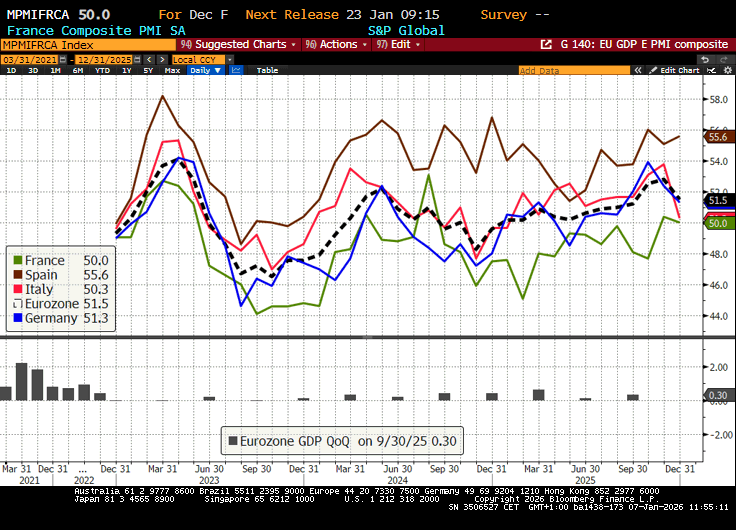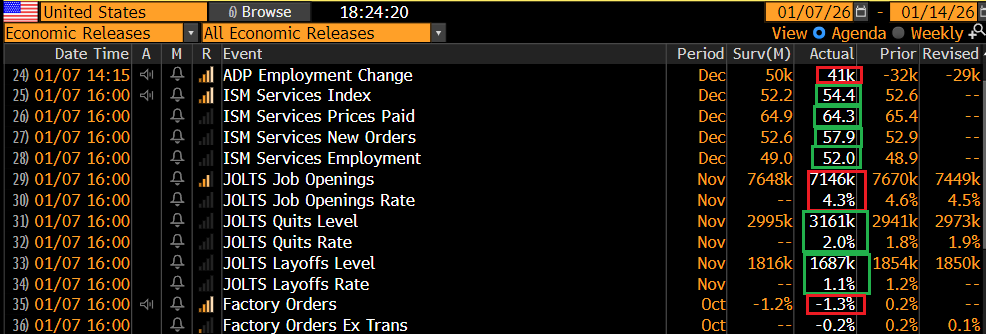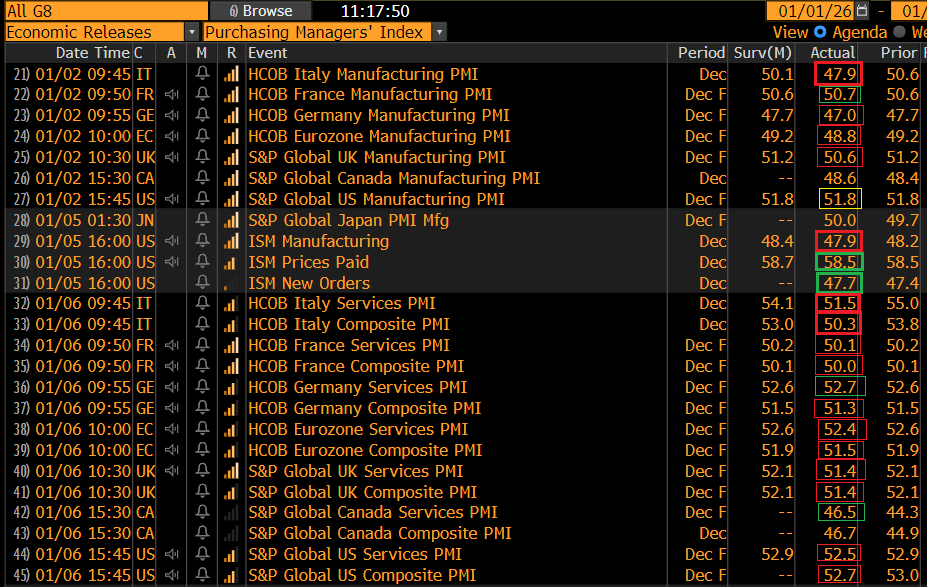 Sul fronte macro, il 2026 fino a ieri ha portato notizie mediocri per l’attività economica. I PMI finali di dicembre e l’ISM manufacturing in US hanno in generale deluso.