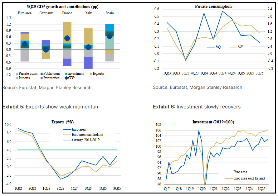 Il dato è stato rivisto al rialzo di poco (da +0.23% a +0.26% mese su mese) e il gioco lo fa l’arrotondamento. Nel dettaglio si nota che a supportare il dato è la crescita degli investimenti, mentre i consumi sono stati deboli e l’export resta sotto la media (grafici di Morgan Stanley)