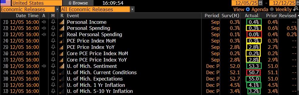 Personal income abbastanza buono a settembre, e sopra attese, mentre lo spending un po’ così. E l’University of Michigan consumer sentiment preliminare di di cembre ha recuperato un po’ più delle attese, trainata dalle aspettative, e con una fiammata di ottimismo nelle aspettative di inflazione.