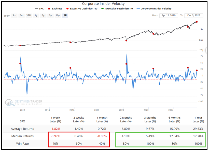 L’indice di insider buying aggregato sulle aziende dell’S&P 500 di Sentimentrader ha superato il primo dicembre il livello di 24, qualcosa che si è visto solo altre 5 volte negli ultimi 15 anni.