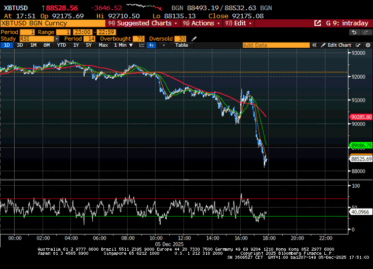 Successivamente, il sentiment si è un po’ opacizzato. Il principale motivo è stata un accelerazione al ribasso delle criptovalute, senza un catalyst specifico che io abbia notato (nella figura Bitcoin).