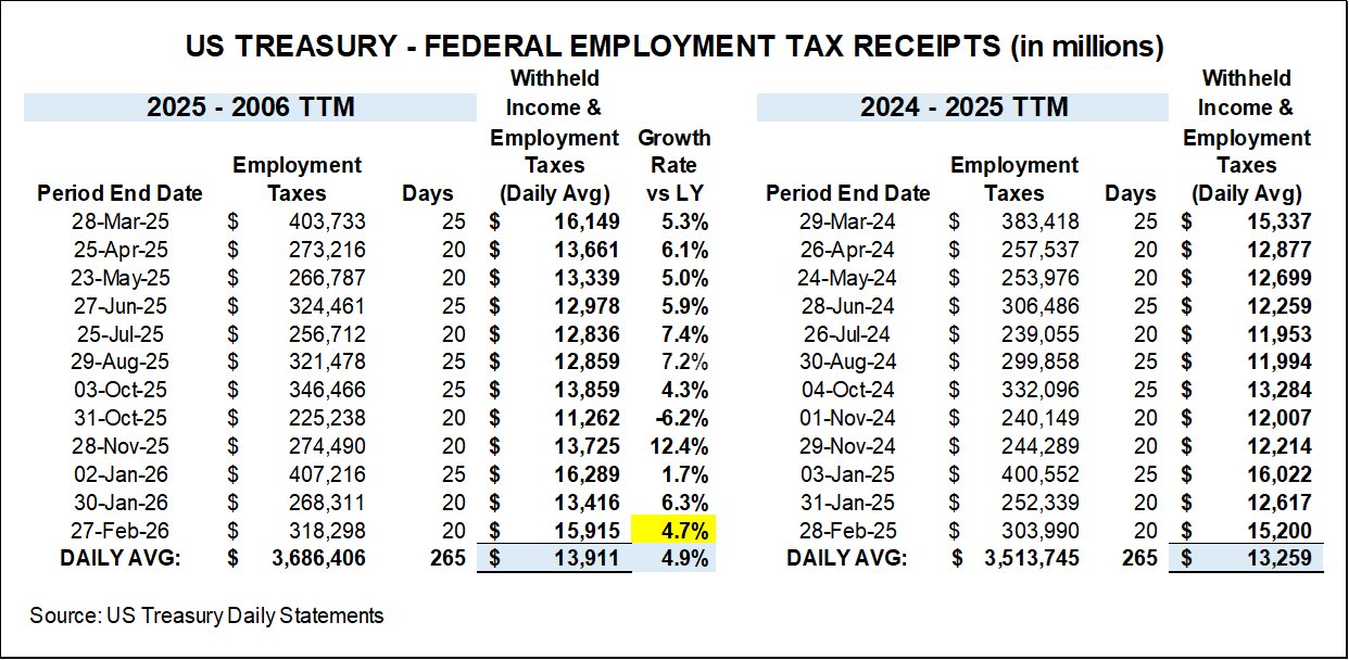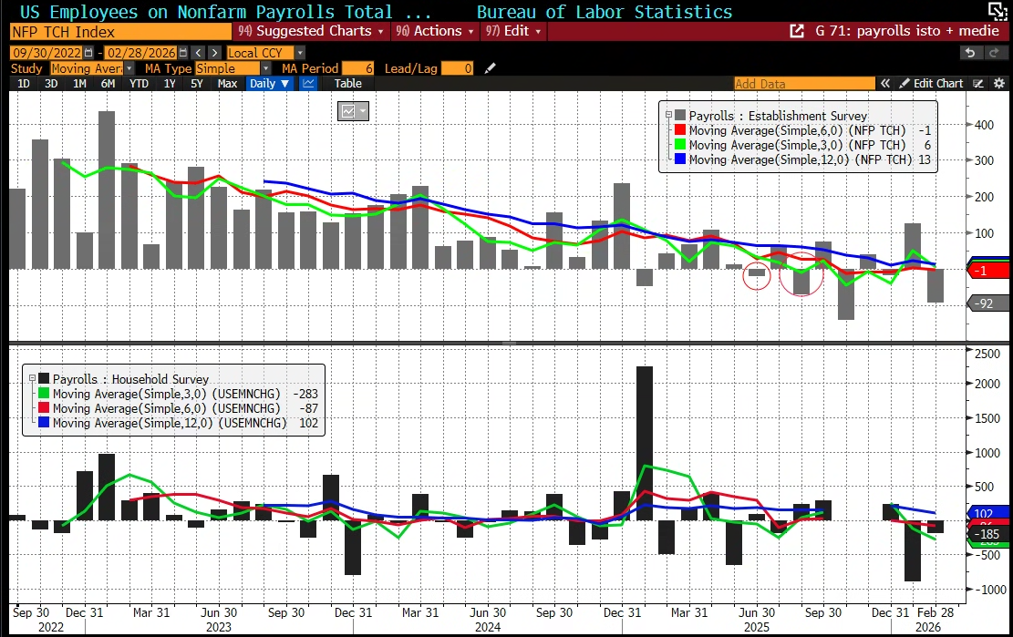 Il labour market report USA di febbraio è stato uno shock, con 92.000 posti di lavoro cancellati, la disoccupazione in aumento al 4.4% la forza lavoro in fortissimo calo, e 185.000 nuovi occupati in meno secondo la Household Survey, che però è stata oggetto di revisione. Sulla scorta di questo report e relative revisioni, le medie trimestrale, semestrale e annuale vanno praticamente a zero.