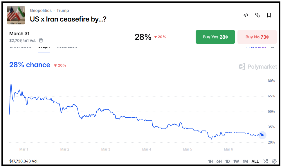 Il petrolio ha accumulato fino a un +8% in mattinata, arrivando ben oltre il +10% nel pomeriggio e questo ha spinto al rialzo i rendimenti e alimentato la risk adversion. Il quadro generale è quello di un consenso che diventa sempre più scettico sulla possibilità di una chiusura in tempi brevi del conflitto (come mostra anche il grafico sotto di Polymarket sulla probabilità che un cessate il fuoco arrivi entro fine mese) e vede il rischio crescente di una radicazione dei rialzi e di uno sconvolgimento del Medio Oriente atto a mantenere stabilmente alta la tensione.