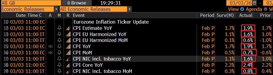 In termini di dati, oggi ha piovuto sul bagnato. Complice un inatteso balzo dell’inflazione italiana, il CPI europeo ha sorpreso al rialzo sia come headline che come core.