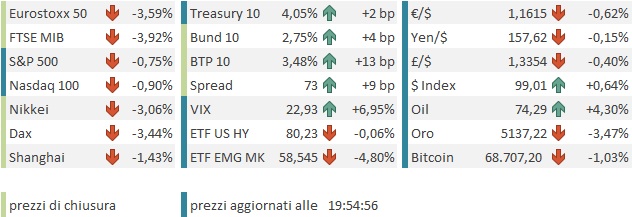 Questo ha permesso alle borse europee di mettere un po’ di distanza dai minimi in chiusura, ma i cali sono comunque molto forti, con solo UK che contiene il passivo sotto il 3%, e l’Ibex che, gratificato dalle minacce di Trump per divergenze sull’uso delle basi, cede il 4.5%.