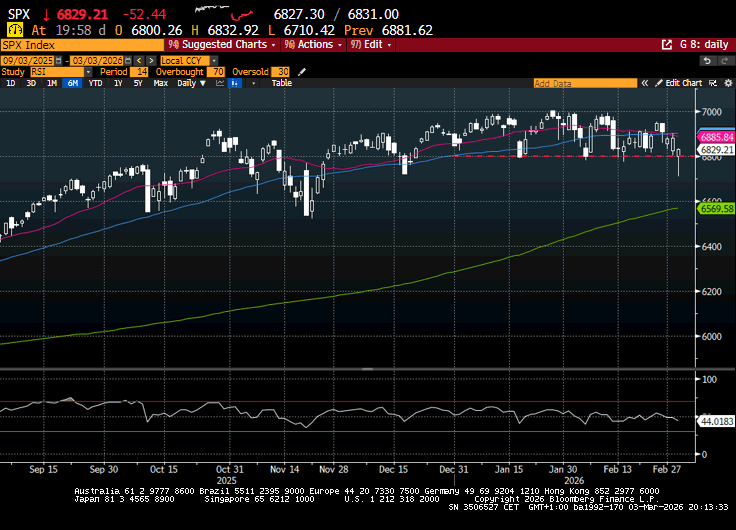La riapertura della seduta asiatica però ha visto il sentiment tornare ad afflosciarsi rapidamente, con i future USA in progressivo calo, e gli indici dell’area ad accumulare pesanti passivi. A fine seduta, c’è poco da scegliere tra le principali piazze. A guidare il ribasso, il Kospi, con un -7.2%. La borsa coreana aveva beneficiato enormemente della forza dei produttori di Semiconduttori, e ora che è partita la correzione anche su quel settore, aggravata dalla risk adversion generale, non sorprende di vedere una frana del genere su un indice che faceva quasi il 50% da inizio anno ( e fa ancora il 37%). Secondo e terzo classificato Nikkei con un -3% e Taiwan con un -2.2%. Due indici anche loro favoriti in passato dalla forza di chip e Ai infrastructure. Male anche Vietnam, mentre Sydney, Mumbai Hang Seng, HSCEI, Shenzen, Shanghai perdono tra l’1% e l’1.5%, e Jakarta si ferma appena sotto l’1%. Il tema è ovviamente sempre la guerra in Iran, con il petrolio che ha continuato a salire, via via che le notizie di bombardamenti e conseguenti chiusure di siti nell’area si sono accumulate, così come le notizie sul crollo del traffico di navi nello stretto di Hormutz.