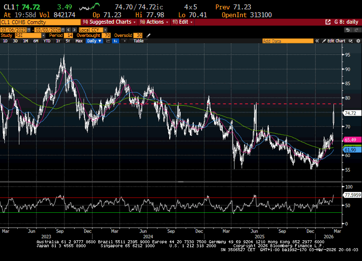 Chiaramente, finche oil e Gas continuano a salire, sospinti dalle notizie di stop alle facilities causate dagli attacchi iraniani, difficilmente potremo vedere una stabilizzazione duratura. Detto questo, il petrolio saliva da inizio anno, in gran parte in previsione di un evento geopolitico come questo. IL’oil si è già portato sui livelli che aveva raggiunto in giugno scorso in occasione dell’operazione Midnight Hammer, sicuramente un’azione più circoscritta, ma forse meno attesa, e comunque le premesse iniziali erano simili a quelle attuali.