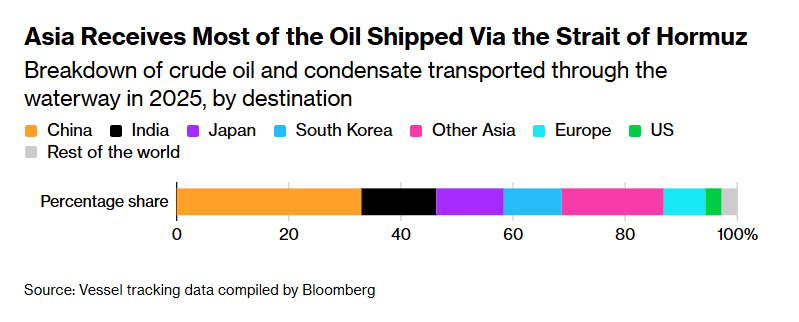 Così, nel corso della seduta asiatica WTI e Brent hanno ripreso a salire, e l’impatto si è notato, con tutti i principali indici in calo. L’QAsia è molto sensibile alle dinamiche nello stretto, in quanto prima beneficiaria dei flussi di oil provenienti che lo attraversano (sotto un grafico di Bloomberg) e infatti nella regione stanno iniziando i primi razionamenti (Pakistan, Sri Lanka, Myammar)
