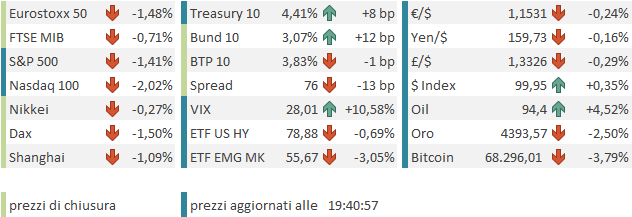 La chiusura europea vede i principali indici cedere tutti oltre il punto percentuale tranne il FTSE Mib e Londra. Ancora più violenti i rialzi dei rendimenti, abbondantemente a doppia cifra su praticamente tutte le scadenze. Se il Bund chiude ben oltre il 3% di rendimento, facendo il nuovo record dal 2011, il BTP 10 anni torna a superare il 4% di rendimento per la prima volta dal marzo 2025, ma il livello è il massimo da giugno 2024. La curva monetaria ECB sconta comodi 3 rialzi dei tassi a ottobre 2026. Se l’€ cede poco, chiuso tra l’impatto della risk adversion, che fa preferire il Dollaro in questa fase, e il violento rialzo delle aspettative di politica monetaria, tra le commodities tornano a salire bene oil e gas e scende il resto, in particolare i metalli preziosi.