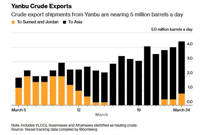 Va detto che, via via che il tempo passa, i flussi di petrolio stanno trovando altre strade per uscire dal Medio Oriente. Il grafico sotto mostra il crescente traffico dal port di Yambu sul Mar Rosso. E inoltre, il traffico di navi che, in virtù di “buoni rapporti” con l’Iran sta riuscendo a passare lo stretto di Hormuz sta crescendo.