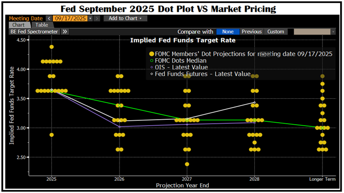 Come mai? Il fatto è che la Dot Plot di settembre scontava il taglio di stasera, ma ne proiettava solo uno per il 2026 intero. Complice il deterioramento del mercato del lavoro (e forse l’assenza di dati di inflazione per via dello shutdown), il mercato si è portato avanti e ne sconta altri 2 entro dicembre prossimo (vedi illustrazione di Bloomberg sotto).