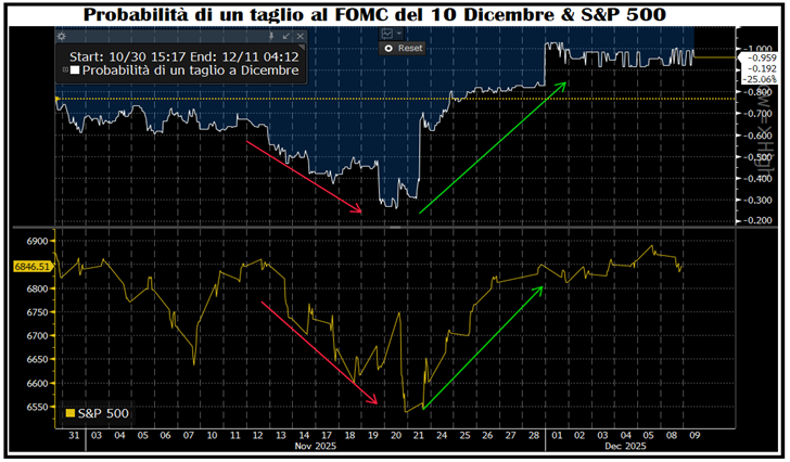 Evidentemente il mercato azionario sembra ritenere fondamentale, per mantenere in piedi il trend positivo, il fatto che la politica monetaria resti molto accomodante. Posto che all’azionario l’easing piace sempre, quando non è legato all’arrivo di una recessione, in questo caso il motivo di questa forte correlazione potrebbe essere che alla Fed il mercato richiede di bilanciare, con una politica monetaria espansiva, l’impatto negativo dell’AI sull’occupazione (vedi Lampi del 20 novembre per un approfondimento) , per evitare che il deterioramento del mercato del lavoro danneggi sentiment e consumi, agendo come un freno per l’economia (e per i profitti aziendali).