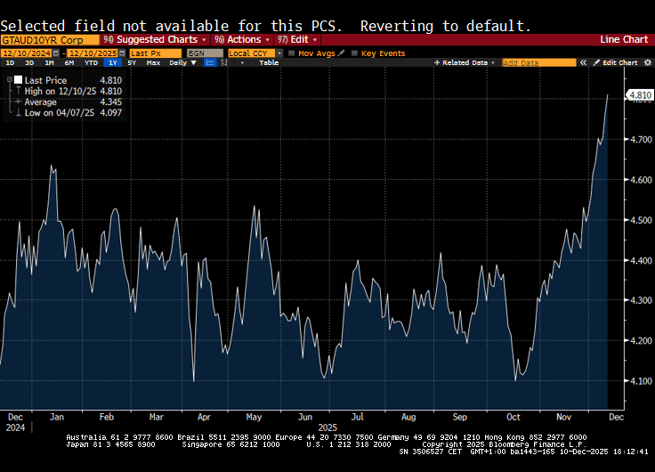 Il nervosismo per la Fed oggi si è intravisto fin dall’Asia. Dei principali mercati solo Taiwan ha mostrato progressi decenti. Hong Kong e HSCEI sono moderatamente rimbalzati, ma avevano ceduto forte ieri e l’altro ieri, in parte per la decisione di Trump di permettere l’esportazione dei chip top di gamma Nvidia in Cina (*TRUMP TOLD XI US WILL ALLOW NVIDIA H200 EXPORTS TO CHINA) cosa che ha depresso i produttori locali. Anche l’Indonesia ha mostrato progressi, mentre Shanghai, Shenzen, Mumbai, Seul hanno mostrato perdite moderate, Vietman ha ceduto oltre un punto. Solo marginalmente in calo Tokyo e Sydney.  Sul fronte rendimenti, interessante l’esplosione di quelli australiani (vedi grafico sotto) seguita alla svolta hawkish del Governatore della RBA Bullock lunedì.