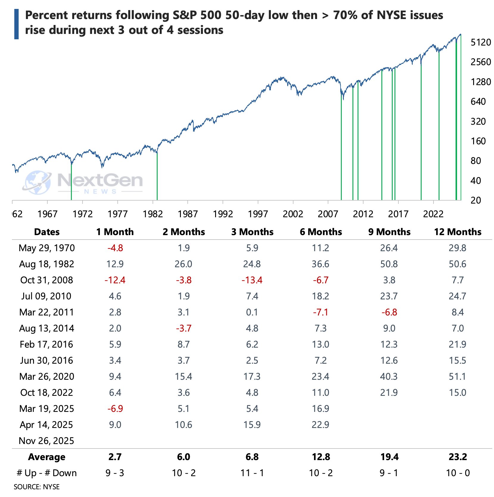 Tornando alla rapidità del rimbalzo, ho trovato questa statistica sul web: tutte le volte che, dopo una capitulation, il rimbalzo è stato rapido e violento (la condizione è che per 3 o 4 sedute oltre il 70% dei titoli del Nyse sia salito) le performance successive sono state egregie, e a 12 mesi il mercato è sempre stato più alto. C’è perfino il caso della capitulation di ottobre 2008: poi il mercato fece il minimo a marzo 2009, e recuperò con forza.