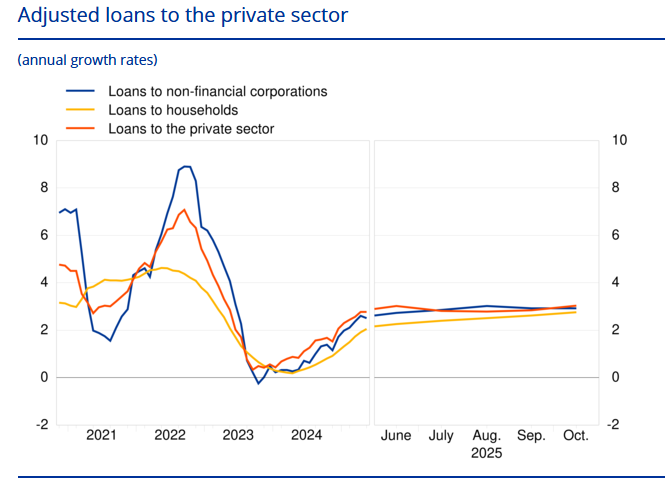 Quindi crescita del credito abbastanza resiliente, grazie alla domanda dei privati, che ha continuato a crescere nella seconda metà del 2025 mentre quella delle aziende invece ha marginalmente rallentato in autunno ma ora sembra stabile.