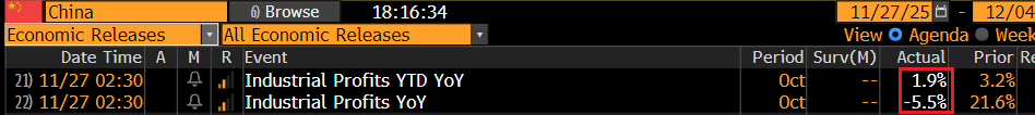 Sul fronte macro, sono stati pubblicati gli industrial profits cinesi di ottobre. Dopo i dati ottimi di agosto e settembre, il mese scorso è stato decisamente mediocre.