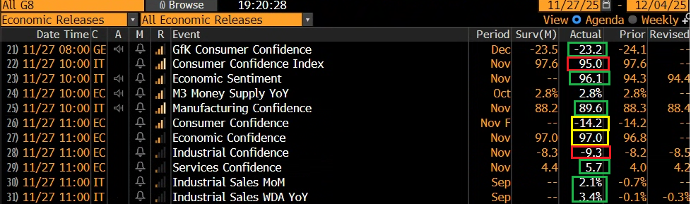Oggi era prevista la pubblicazione di alcuni dati di confidence, che a mio parere lasciano il tempo che trovano, e comunque sono contraddittori tra di loro. Buono, il fatturato all’industria italiano di Settembre, ma è più old news dei dati post shutdown in US.