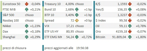 Nel pomeriggio, assenti dati e news USA e Wall Street, l’attività si è acquietata. Come spesso succede gli indici EU hanno attenuato i modesti guadagni e hanno chiuso distribuiti attorno alla parità. I rendimenti hanno conservato i magri rialzi e i cambi sono rimasti stabili. Rimbalzo del petrolio tra le commodity, e delle cripto.